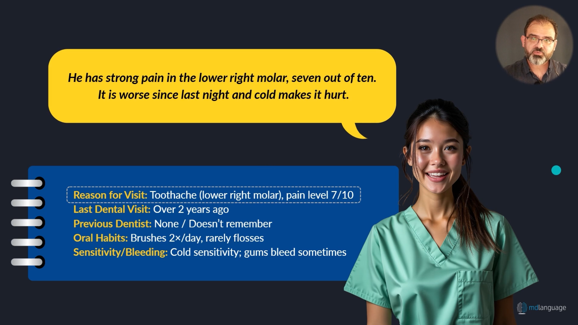 MdLanguage recrea situaciones reales de la clínica dental: recepción, anamnesis, explicación de procedimientos, indicaciones post-operatorias y seguimiento.